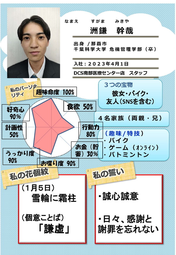 彼はとても物腰が柔らかく明るい性格の男子です。彼のいい所は、常に笑顔でいて、また与えられた仕事もしっかりとこなしていく頼れる次期リーダーです。そんな彼に私自身、今後に期待しています。