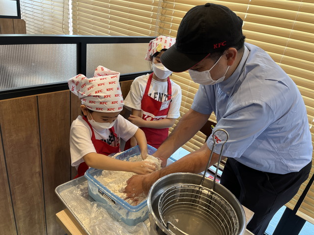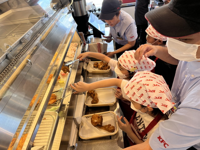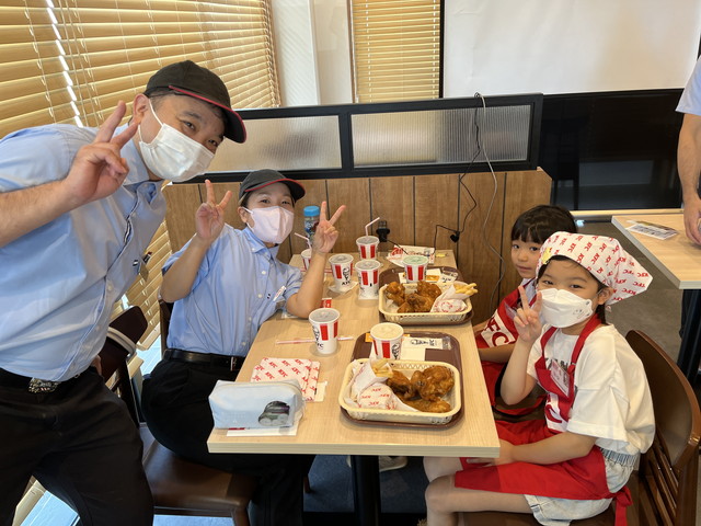 コロナ明け、久々のキッズスクールということで、今回は店舗に勤めている従業員のお子様を対象に開催いたしました。子供達は普段お父さんやお母さんの仕事に接する機会がないので、職場での仕事内容やカーネルサンダースさんのお話を通して、仕事の楽しさや喜びを体験して欲しいとの思いで開催しました。